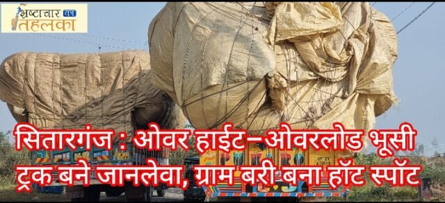 ऊधम सिंह नगर जिले के सितारगंज में परिवहन विभाग की लापरवाही अब सीधे लोगों की जान पर भारी पड़ती दिख रही है। सितारगंज में ओवर हाईट और ओवरलोड भूसी के ट्रकों का आतंक लगातार बढ़ता जा रहा है। ग्राम बरी, सितारगंज विधानसभा यूपी मार्ग से उत्तराखंड में प्रवेश करते ही ग्राम बरी ओवर हाईट – ओवरलोड ट्रकों का सबसे बड़ा हॉट स्पॉट बन चुका है। यहाँ प्रतिदिन दर्जनों ओवर हाईट और ओवरलोड भूसी ट्रक दिन-दहाड़े और रात के अंधेरे में परिवहन विभाग