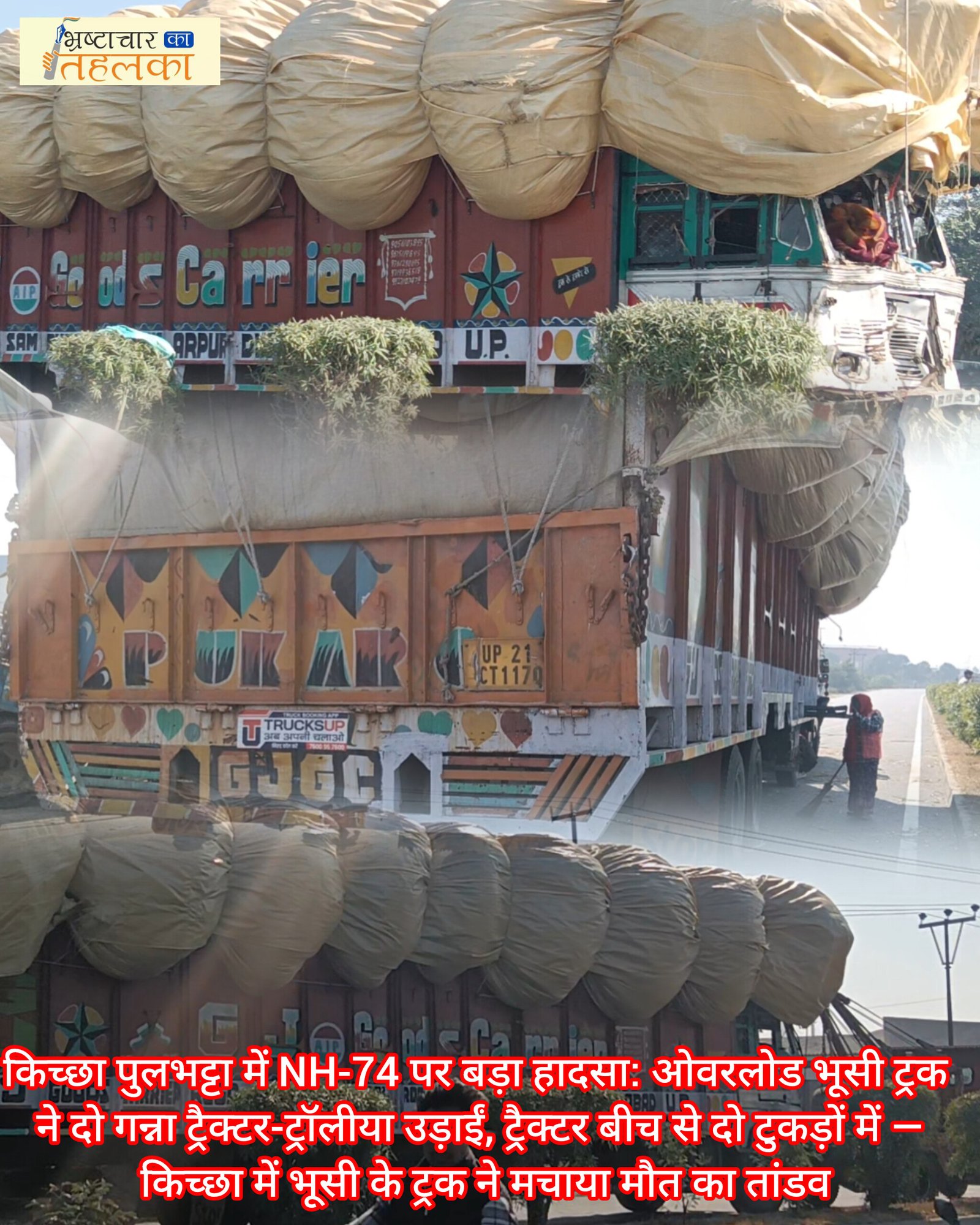 ब्रेकिंग न्यूज़: किच्छा में NH-74 पर बड़ा हादसा: ओवरलोड भूसी ट्रक ने दो गन्ना ट्रैक्टर-ट्रॉलीया उड़ाईं, ट्रैक्टर बीच से दो टुकड़ों में — किच्छा में भूसी के ट्रकों का मौत का तांडव