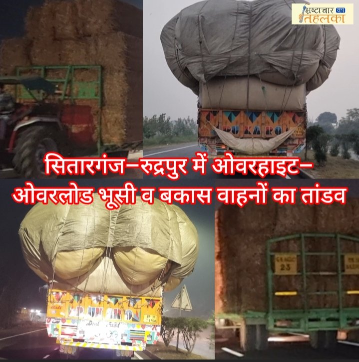 बलदेव सिंह, भ्रष्टाचार का तहलका न्यूज़। ऊधम सिंह नगर जिले की सितारगंज एवं रुद्रपुर तहसील क्षेत्र में ओवर-हाइट एवं ओवर-लोड भूसी व बकास से लदे ट्रक और ट्रैक्टर-ट्रॉलियों का संचालन पूरी तरह से बेलगाम हो चुका है। हालात ऐसे हैं कि हाईवे से लेकर शहरी मार्गों तक दिन-रात सैकड़ों भारी वाहन क्षमता से कई गुना अधिक भार और खतरनाक ऊँचाई लेकर फर्राटा भर रहे हैं, लेकिन परिवहन विभाग (RTO) के सचल दल अधिकारी मूकदर्शक बने हुए हैं।
