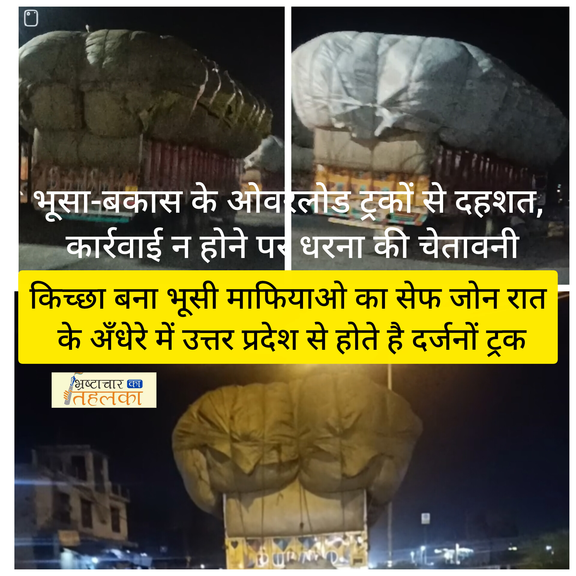 बलदेव सिंह की रिपोर्ट, भ्रष्टाचार का तहलका न्यूज़। रुद्रपुर/किच्छा। ऊधम सिंह नगर जिले में ओवर-हाइट और ओवरलोड वाहनों का आतंक लगातार बढ़ता जा रहा है। खासतौर पर भूसा, बकास और लकड़ी से भरे ट्रक एवं ट्रैक्टर-ट्रॉलियां सड़कों पर खुलेआम नियमों की धज्जियां उड़ा रहे हैं, जिससे आए दिन सड़क दुर्घटनाएं हो रही हैं और आम जनता की जान जोखिम में पड़ रही है। सूत्रों के अनुसार, किच्छा, सितारगंज और रुद्रपुर क्षेत्र में सैकड़ों की संख्या में ओवरलोड वाहन दिन-रात बिना रोक-टोक दौड़ रहे हैं। इन वाहनों की ऊंचाई और भार दोनों निर्धारित मानकों से अधिक हैं, लेकिन इसके बावजूद परिवहन विभाग की ओर से कोई प्रभावी कार्रवाई नहीं की जा रही है। स्थानीय लोगों का आरोप है कि परिवहन विभाग के सचल दल अधिकारी न तो नियमित चेकिंग कर रहे हैं और न ही नियमों का उल्लंघन करने वाले वाहनों पर सख्ती दिखा रहे हैं। हाईवे और शहरों के मुख्य मार्गों पर ऐसे वाहन खुलेआम गुजर रहे हैं, जिससे कई गंभीर हादसे हो चुके हैं, जिनमें जनहानि और आर्थिक नुकसान भी शामिल है।