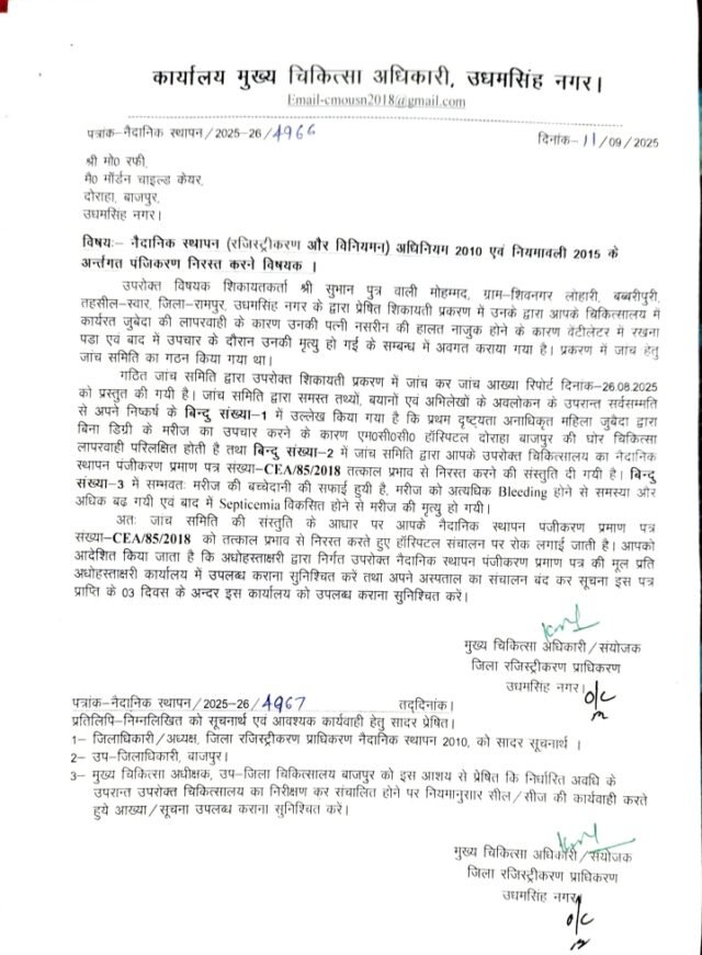 CMO ने तीन दिन की मोहलत देकर अस्पताल बंद कराने और प्रमाणपत्र की मूल प्रति जमा कराने का आदेश दिया था। आदेश की प्रतिलिपि एसडीएम बाजपुर और मुख्य चिकित्सा अधीक्षक उप-जिला चिकित्सालय बाजपुर को भी भेजी गई थी ताकि समय पर अस्पताल सील हो। लेकिन हकीकत यह है कि किसी अधिकारी ने मौके पर जाकर कार्रवाई नहीं की।